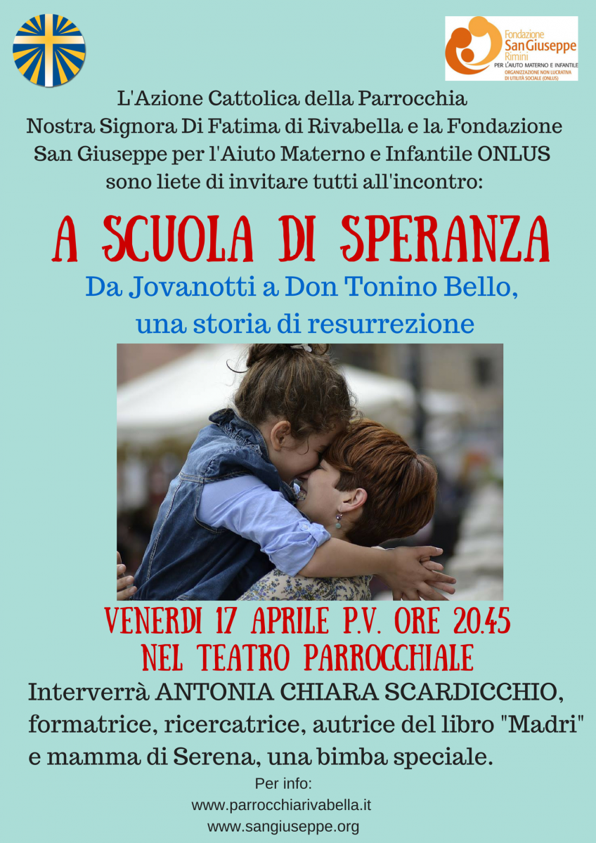 scuolasperanzaLa proposta di questa serata è nata dall’incontro tra la sensibilità educativa dell’Azione Cattolica, che da alcuni anni promuove incontri di formazione su tematiche di attualità nella Parrocchia N.S. Di Fatima di Rivabella e l’attività della Fondazione San Giuseppe, da oltre cent’anni impegnata nella promozione di una positiva cultura dell’infanzia e della maternità e che ha concretamente contributo alla pubblicazione del libro “Madri” per sostenere le spese del sostegno scolastico per Serena.