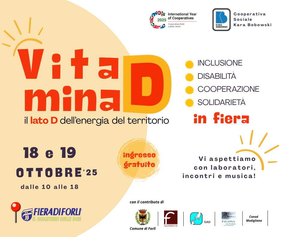 Il 18 e 19 ottobre 2025, presso gli spazi della Fiera di Forlì, si terrà la prima edizione di Vitamina D, fiera dedicata a inclusione, disabilità e cooperazione organizzata dalla Cooperativa Sociale Kara Bobowski di Modigliana.