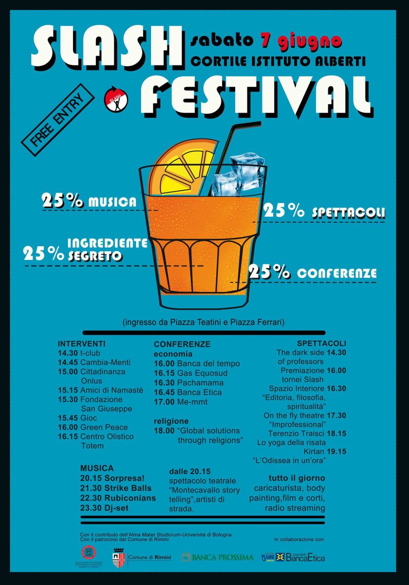 Sabato 7 Giugno p.v. parteciperemo anche noi a “Slash Festival”, un evento completamente gratuito promosso dall’Associazione universitaria Slash di Rimini a base di conferenze, spettacoli, musica. Un’occasione per l’Università di integrarsi con il territorio e per la città di conoscere meglio il mondo universitario!